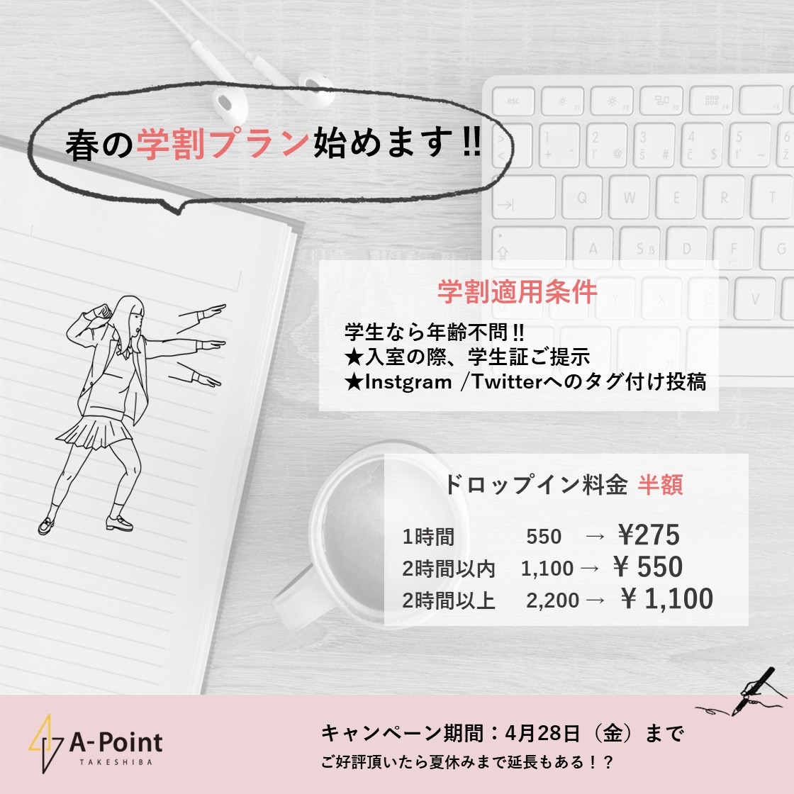 学生証のご提示で利用料金が50%オフになる受験生応援キャンペーン『学割!ドロップイン50%オフ』を実施いたします。